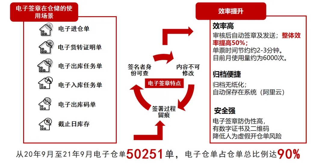 改變紙質(zhì)倉(cāng)單上“蘿卜章”層出不窮、倉(cāng)單真實(shí)性難以核實(shí),單據(jù)流轉(zhuǎn)效率低的弊病,引入電子簽約平臺(tái),實(shí)現(xiàn)全單據(jù)流轉(zhuǎn)數(shù)字化,保障倉(cāng)單內(nèi)容及簽署方真實(shí)性和可溯源,流轉(zhuǎn)效率和可信度大幅提升,整體效率提高了50%。